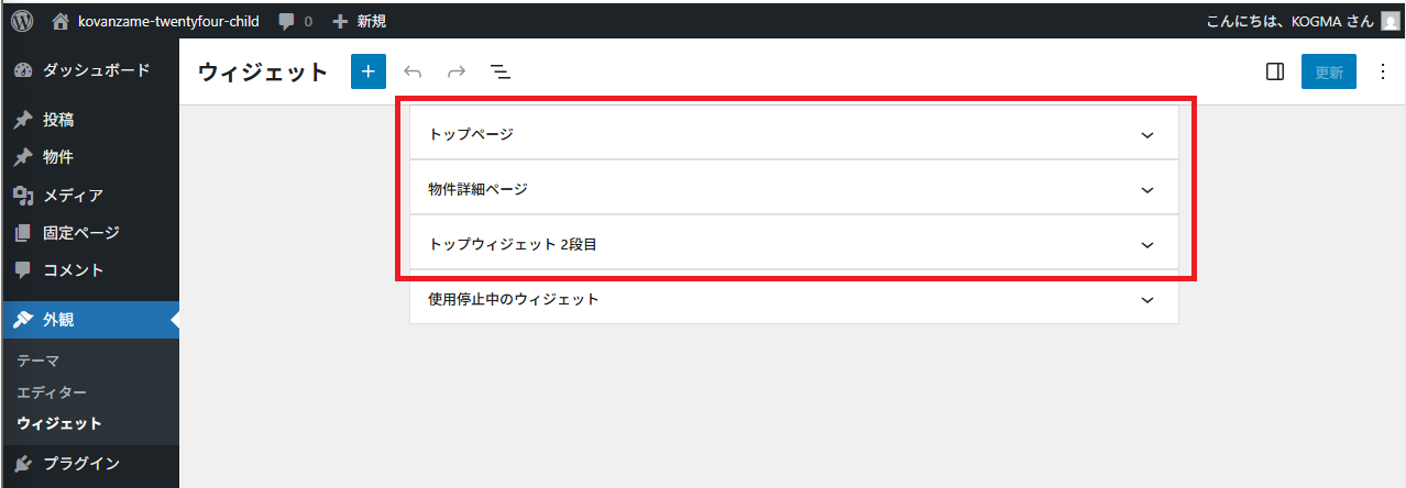 KOVANZAME Twenty Twenty-Four Childをインストールして追加されるパーツは、トップページと物件詳細ページ、トップウィジェット 2段目です。このパーツ内にウィジェットをドラッグで有効化していきます。